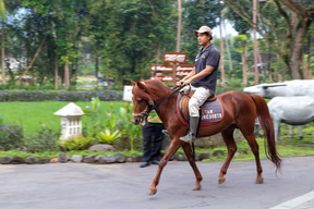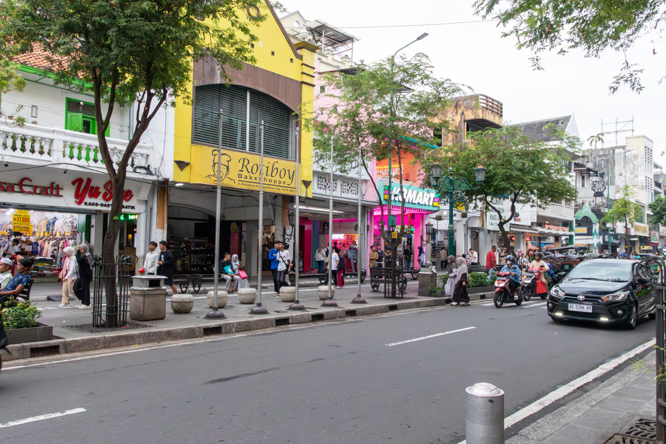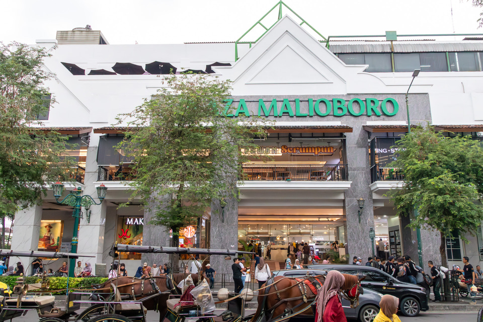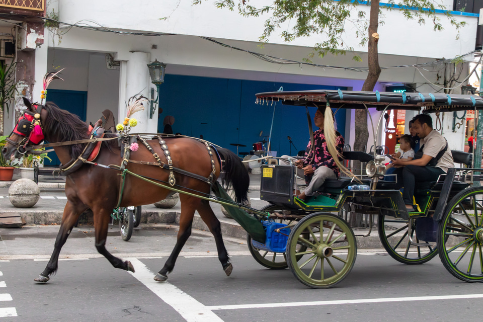クルマに乗ること1時間30分ほどでジョグジャカルタの市内に到着。先にも紹介したとおり、市内には王宮があり、そこに続いているのがメイン通りの「マリオボロ通り」。お店なども集まっており、とてもにぎやかで人通りも多い。観光客向けの馬車も頻繁に行き交っており、カポカポと蹄を鳴らしながら目の前を通り過ぎていく。