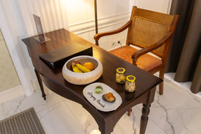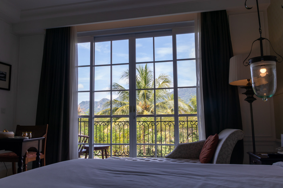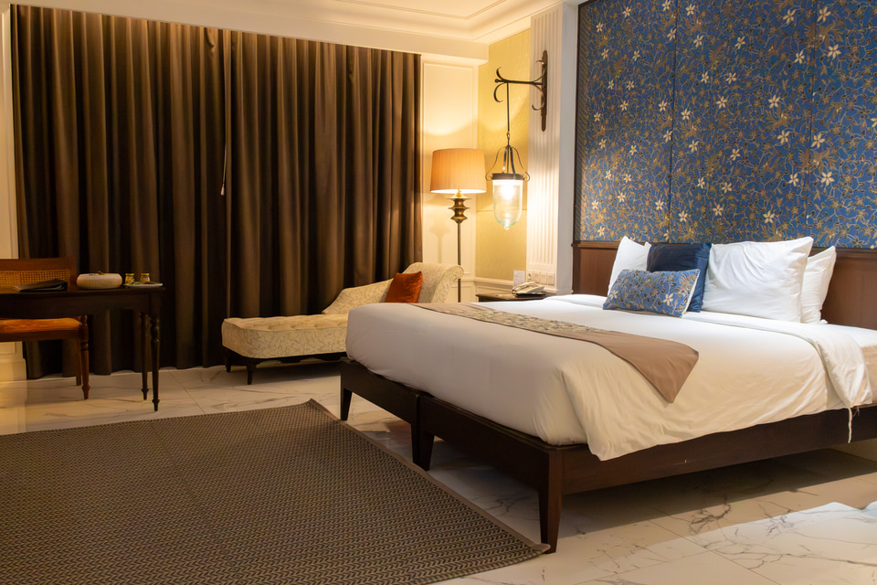 宿泊したの部屋はデラックス プレミアルームで、広い室内にはキングサイズのベッド(ツインタイプもあり)、寝転ぶことができるソファ、デスクが設置されていた。インテリアは草花をモチーフにしたデザインで落ち着きがあり、自然を大切にしているコンセプトが伝わってくる。コンセントはインドネシア標準のCタイプなので、変換プラグは忘れずに。