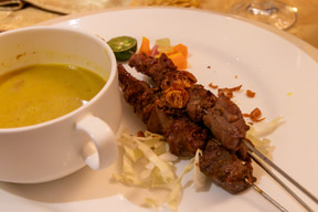 ディナーはリゾート&スパにあるダイニング「パティオ コロニアル ホール(Patio Colonial Hall)」でいただいた。こちらのレストランでは、インドネシアの伝統的な料理から各国の料理まで幅広く提供している。今回サーブされたのはインドネシアの伝統料理で、ガドガドやテンペ、サテ・カンビン(ヤギの串焼き)など、バリ島でもヘビロテで食べていた懐かしく感じるメニュー。もちろん、ワイルドな屋台とは違い、洗練されたシェフが腕を振るっているので上品な味わいだ。