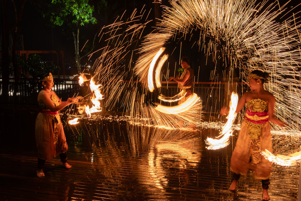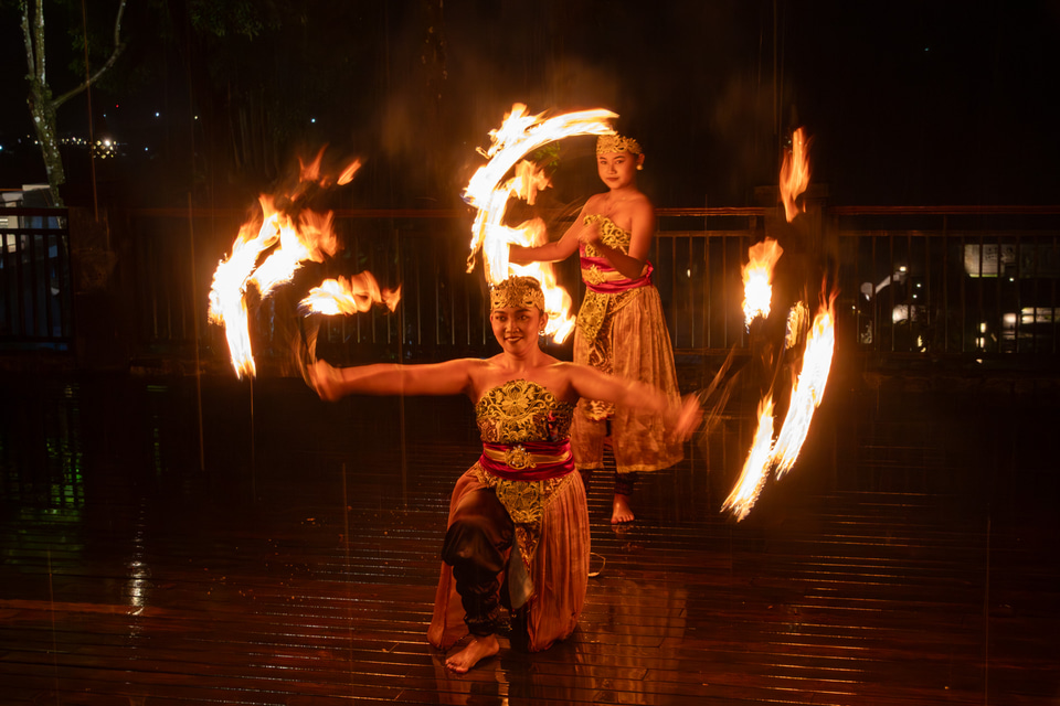 夢中で食べていたら、そのうちガムランの音楽とともに舞踊が始まった。この辺りがインドネシア的な魅力であり、隣のオーストラリア人らしい家族も興味深く鑑賞していた。そして数分後、今度はテラスでファイヤーダンスが始まった。実はこのとき、外は結構な雨が降っていたのだが、そこはプロフェッショナル。にこやかに妙技を披露していた。