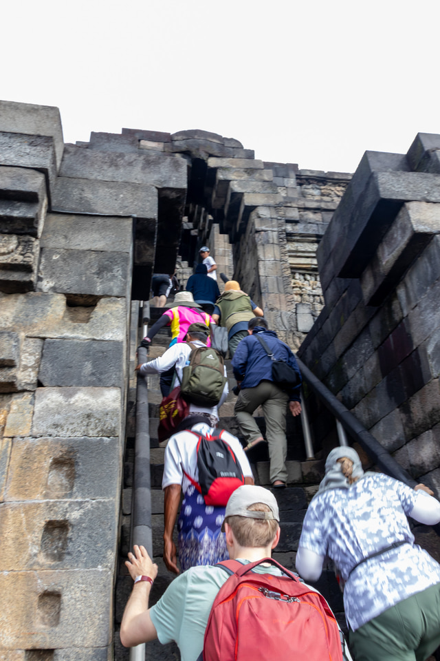 そして待ちに待ったボロブドゥール寺院へ向かう。ボロブドゥールは世界文化遺産として登録されていることもあり、1日の入場人員は1200人まで、さらに遺跡内は1時間150人までと制限がある点は要注意。近づくとその大きさに誰もが圧倒されることだろう。思っていた以上に「デカイ!」というのが偽らざる感想だ。