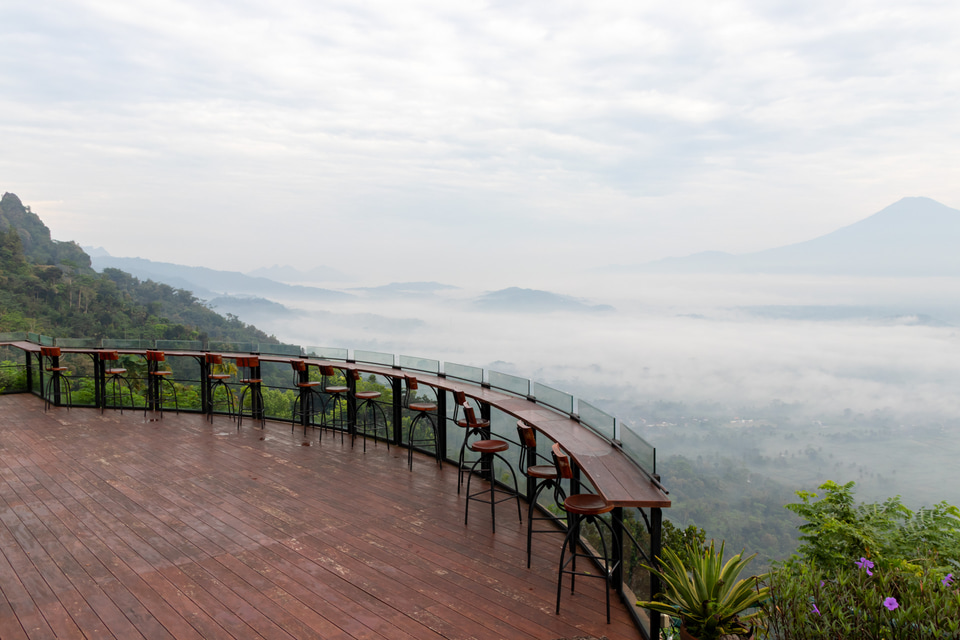 名前からしてすごい朝焼けが見れる感じだが、当日はあいにくの空模様で雲のなか。そう、標高400m以上にあるので、本当に雲のなかのようだった。それでも参加メンバーの日頃の行ないのおかげか、うっすらと陽光も射して壮大なムラピ山の姿が現われたときは、誰もが無心にシャッターを切っていた。自分ではない誰か、ありがとう!