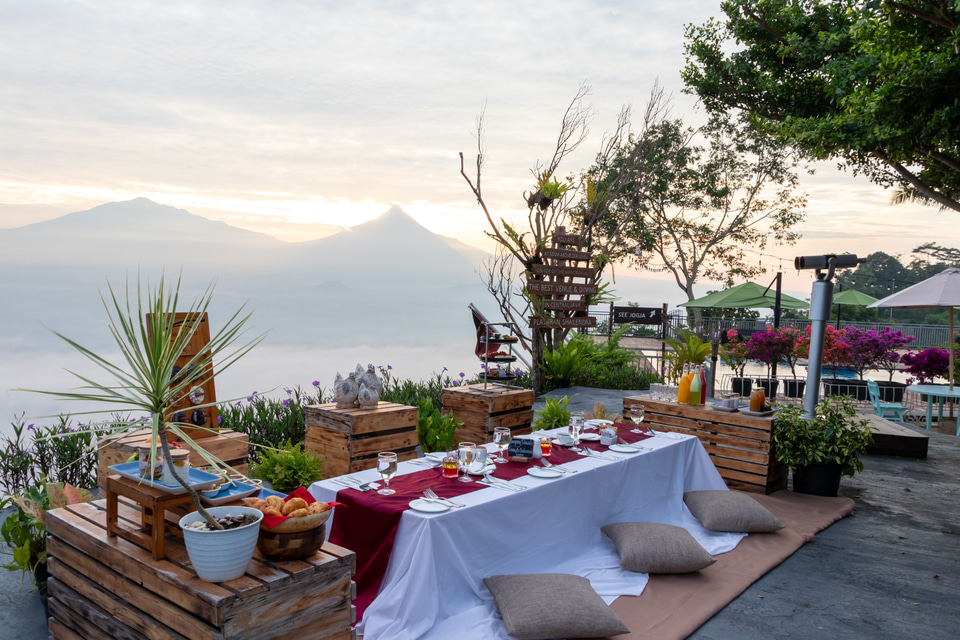 翌朝はホテルのオプションアクティビティにも掲示されていた「マジェスティック サンライズ ブレックファースト」に参加した。この特別な朝食は、ホテルがある場所よりもさらに高台にある複合施設「プラタラン シャイエンドラ(Plataran Shailendra)」内のレストラン「エナム ランギット(Enam Langit)」でいただくものだ。