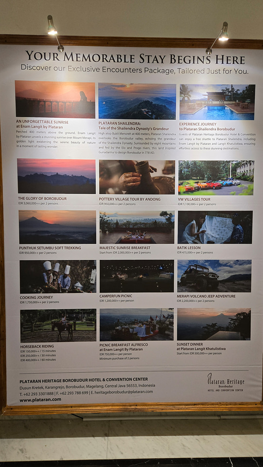 プラタラン ヘリテージはボロブドゥール寺院から1kmほど離れた高台にあり、寺院観光のロケーションとしては最高だ。ちなみに同じ敷地内には「プラタラン ボロブドゥール リゾート&スパ(Plataran Borobudur Resort&Spa)」もある。ヘリテージはコンベンションセンターも備えた統合型ホテル、リゾート&スパの方はその名のとおりバカンス向けという違いがある。
