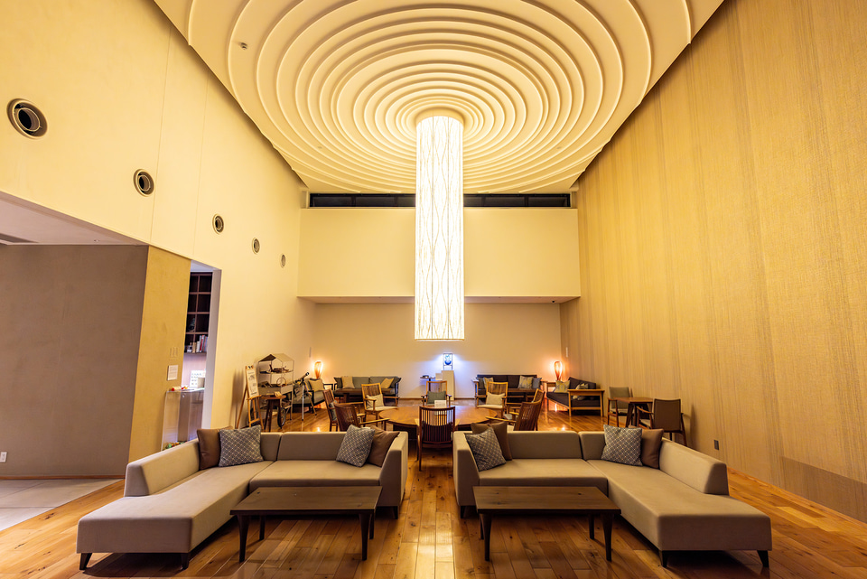 当初、宿の名前を聞いたときには「荘」という名称から大きめの民宿のような施設なんだろうな、と思っていたが、実際に訪れてみると普通にホテルの見た目だし、エントランスからなかに入りレセプションやロビーまわりを見ても同様の雰囲気。