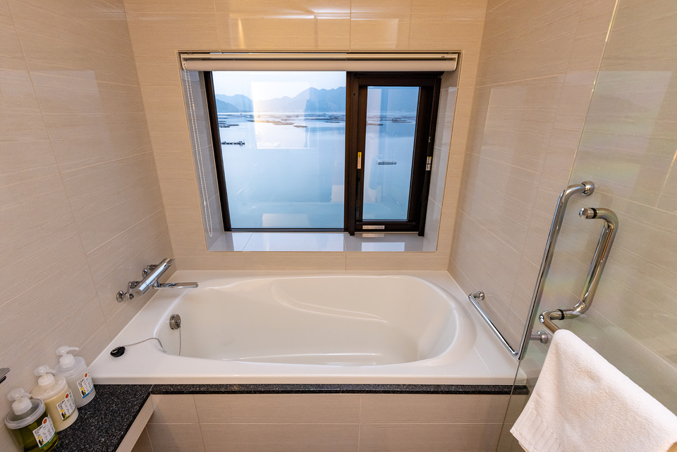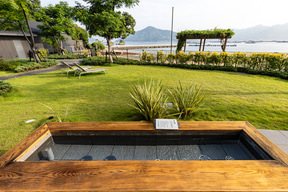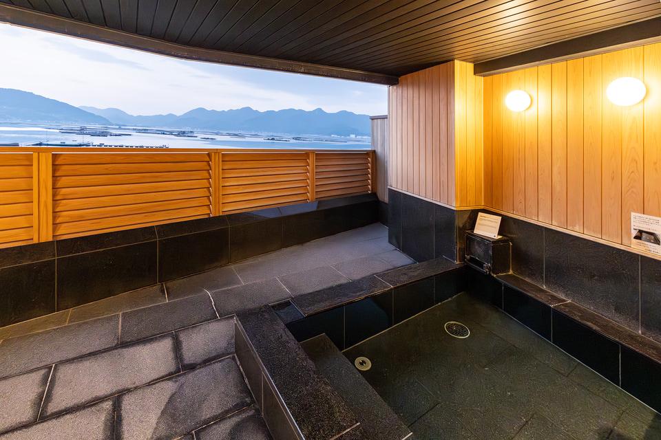 そんな宿の魅力は立地と温泉だ。前回の記事で紹介したように江田島は上から見たロブスターのようなカタチをしており、この江田島荘はちょうど頭の先端に位置する。広島港を結ぶフェリーの中町港から約1kmほどで、歩いてもアクセス可能(事前予約で送迎も可)と抜群の立地。