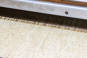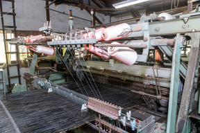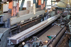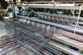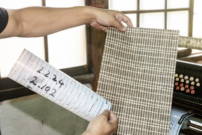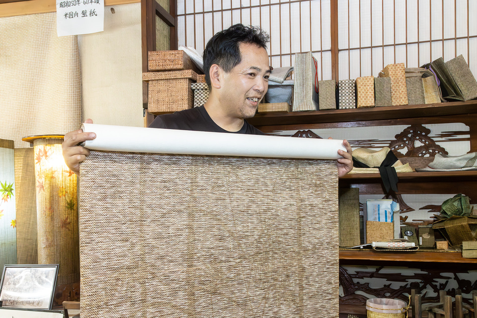 ここで作られているのは「紙布(しふ)」の壁紙。紙布とは文字どおり紙で作った布のことで、その発祥は江戸時代。衣料をはじめさまざまな商品に採用されていたが、通気性や吸湿性が高く結露しにくいことから壁紙には最適だといい、国内はもとより海外でも高い評価を受けているとか。