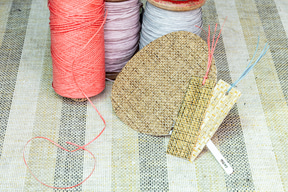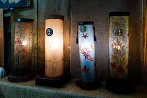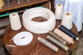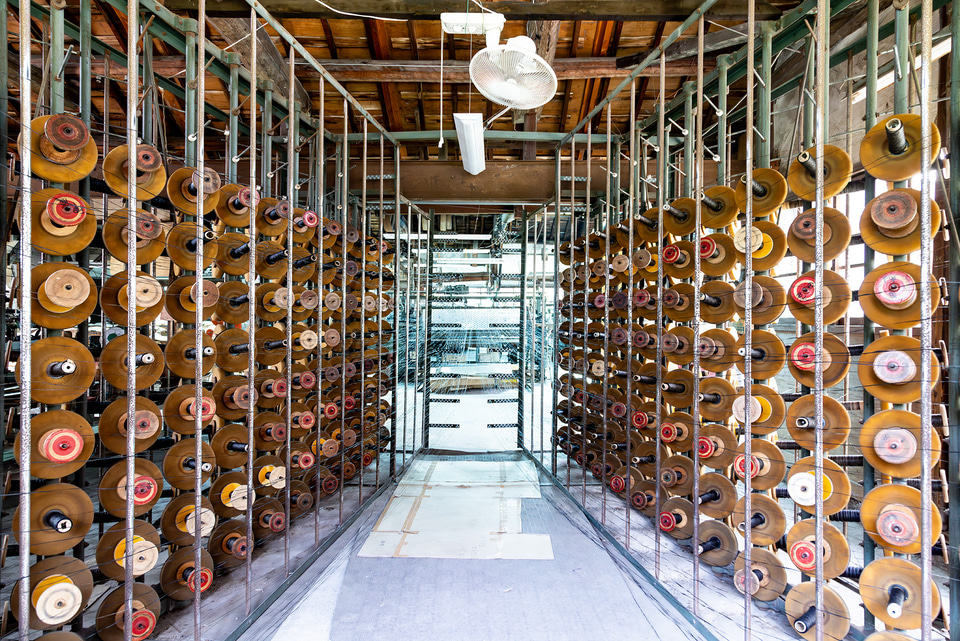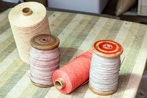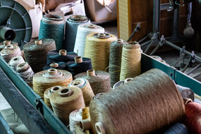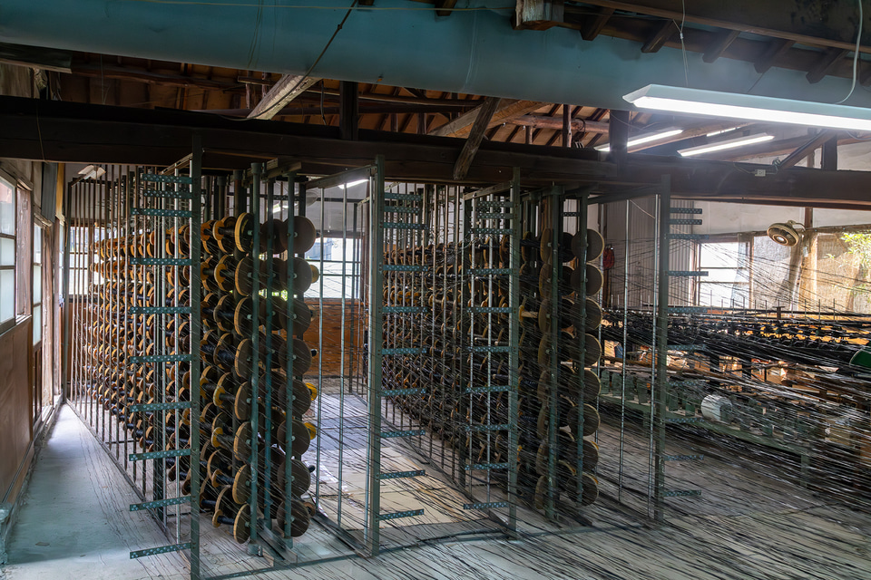 まずは歴史を感じさせる工場内へ。太い梁の下に年代モノの自動織機が並び、大量の糸車から織機へと伸びていく糸の眺めは圧巻。機械好きにはたまらない空間で何時間でも眺めていたいと思えるほど。計1時間半ほど滞在していたが団扇づくりもそこそこに入り浸ってしまった。工場見学は事前に電話での直接申し込みとなり、雑貨づくりは3名以上からで料金は1人1000円~。
