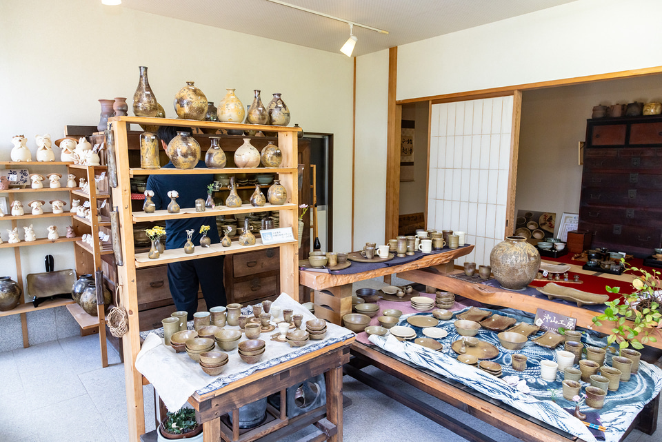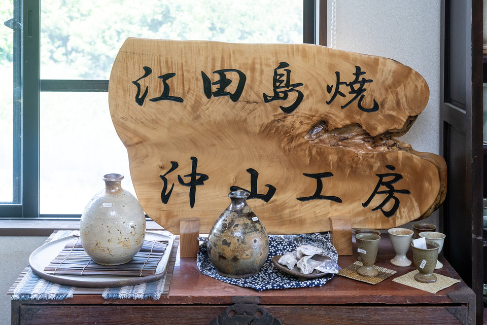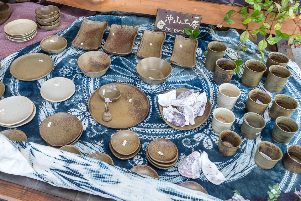 その特徴は釉薬に牡蠣の殻を焼いた灰を混ぜていることで、工房主の沖山努氏が江田島ならではの作品をと試行錯誤して生み出されたもの。牡蠣殻釉薬を使った江田島焼きは独特の風合いや模様ができるという。この工房では作品の展示や販売を行なうギャラリーのほか陶芸体験も行なっており、初心者でも江田島焼の作品づくりが楽しめる。