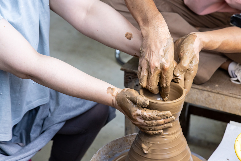 今回行なうのは手まわしろくろを使った「ひもづくり」と呼ばれる行程になる。用意されている粘土をひと握り取って円形に伸ばして底になる部分を作ったあと、ひものように伸ばした粘土を積み上げていく。言葉で書くと簡単だけど、普通の粘土のようにつなぎになる成分が入っていないこともあってなかなかに難しい。