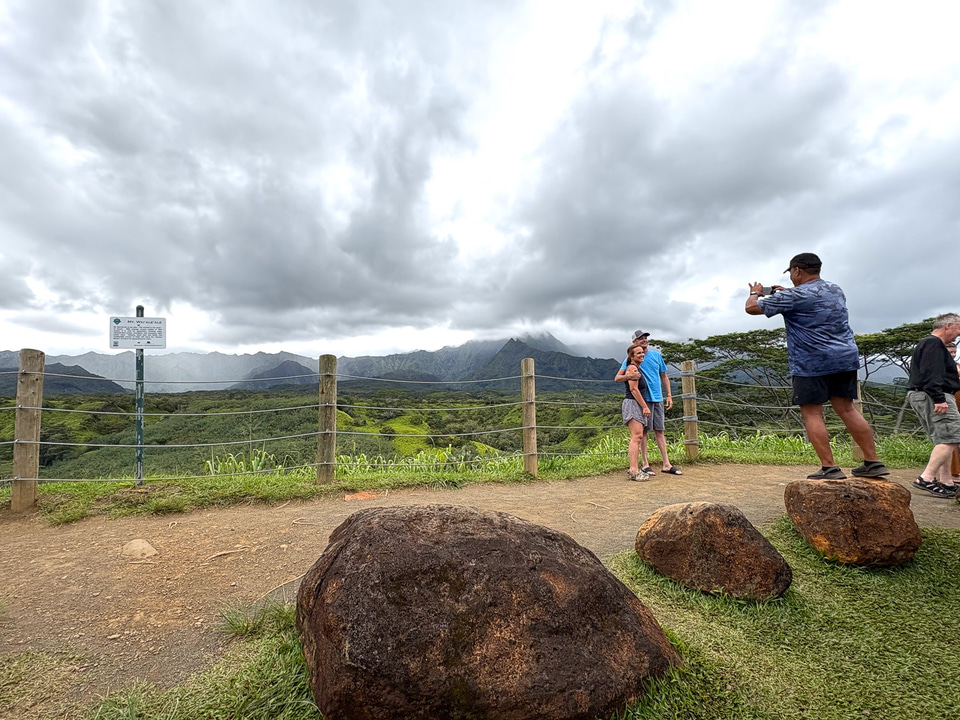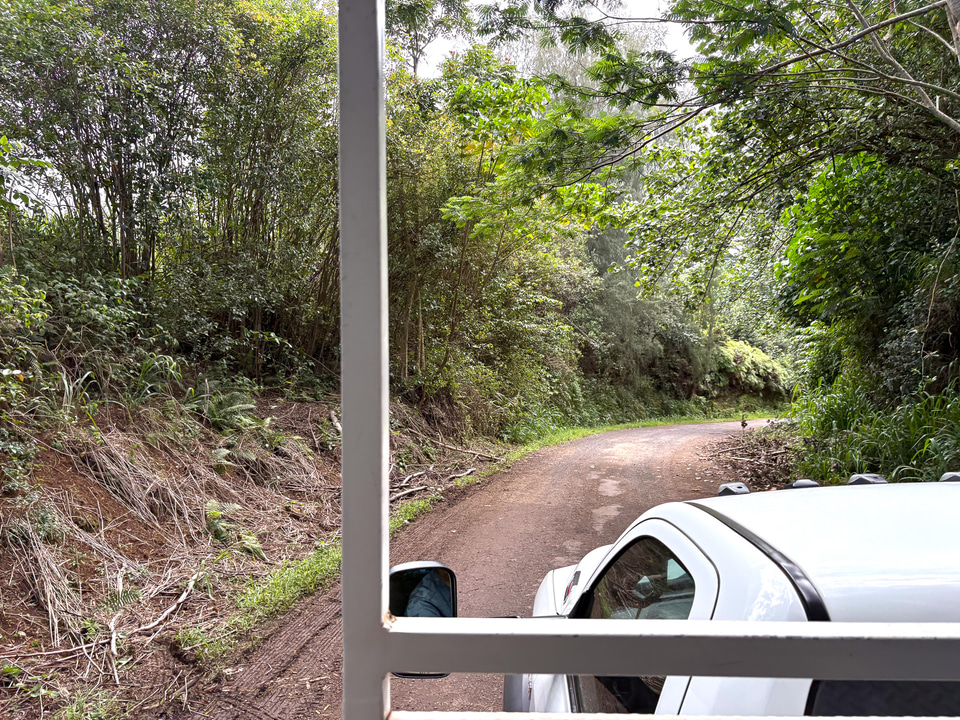 途中、絶景スポットで記念撮影タイムも。目の前の神々しい山はワイアレアレ山で、降雨量の多いこの山頂から水路に水が流れてくるという。