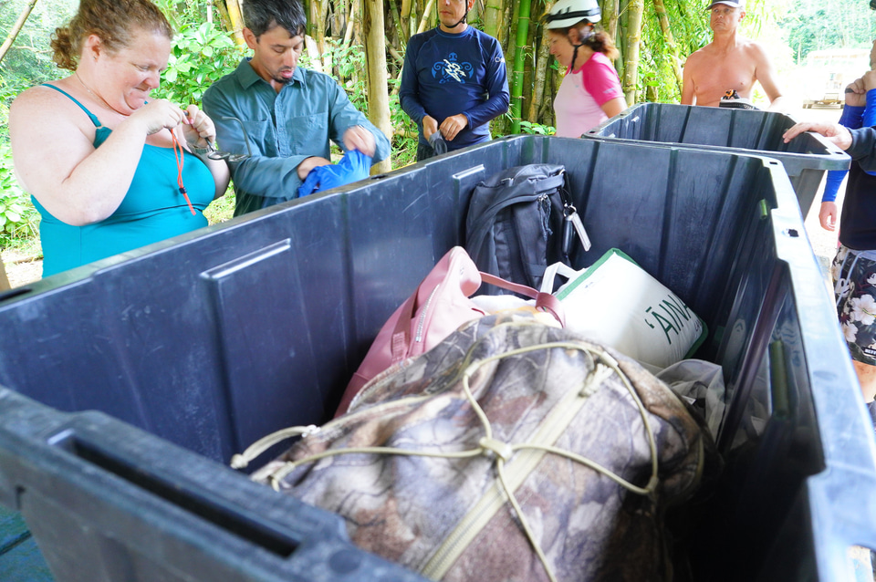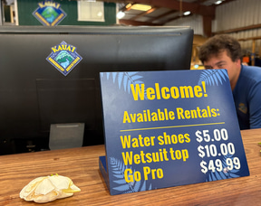 集合場所は、リフエ空港からクルマで約6分。広大な駐車場にクルマを停めて建物のなかへ入ると、正面に受付カウンターがある。参加には足を固定できるウォーターシューズが必要だが、ない場合は5ドルでレンタルできる。受付をすませたら、奥にあるテーブル席でくつろいで待とう。更衣室やトイレもこのなかに完備されている。
