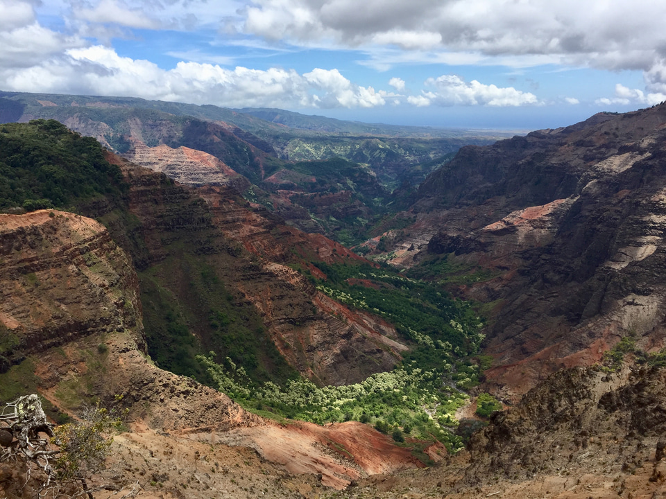 ハワイ諸島は太平洋プレートに乗って毎年約6~8cmずつ北西(日本の方角)に向かって移動しているが、その先頭の最北にあるのがカウアイ島で、500~600万年前に火山活動によって形成された。島の中央にそびえるワイアレアレ山に降る雨の量は世界最多、緑が生い茂るこの島は「ガーデンアイランド」と呼ばれている。