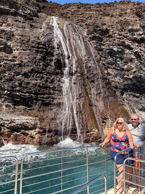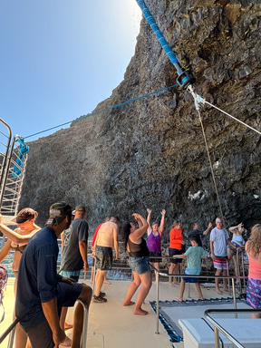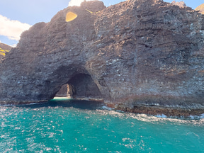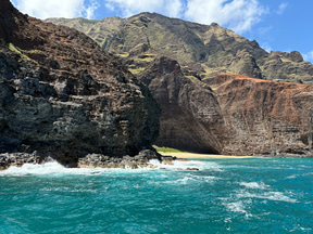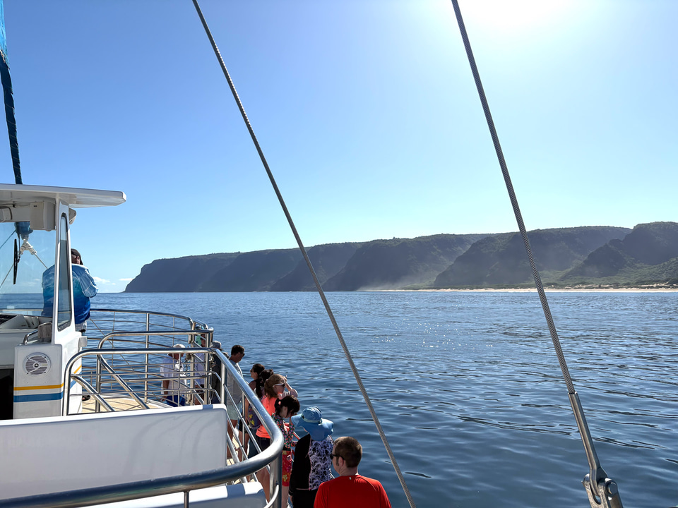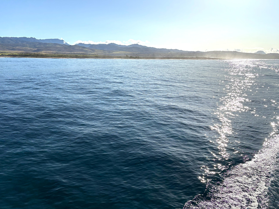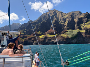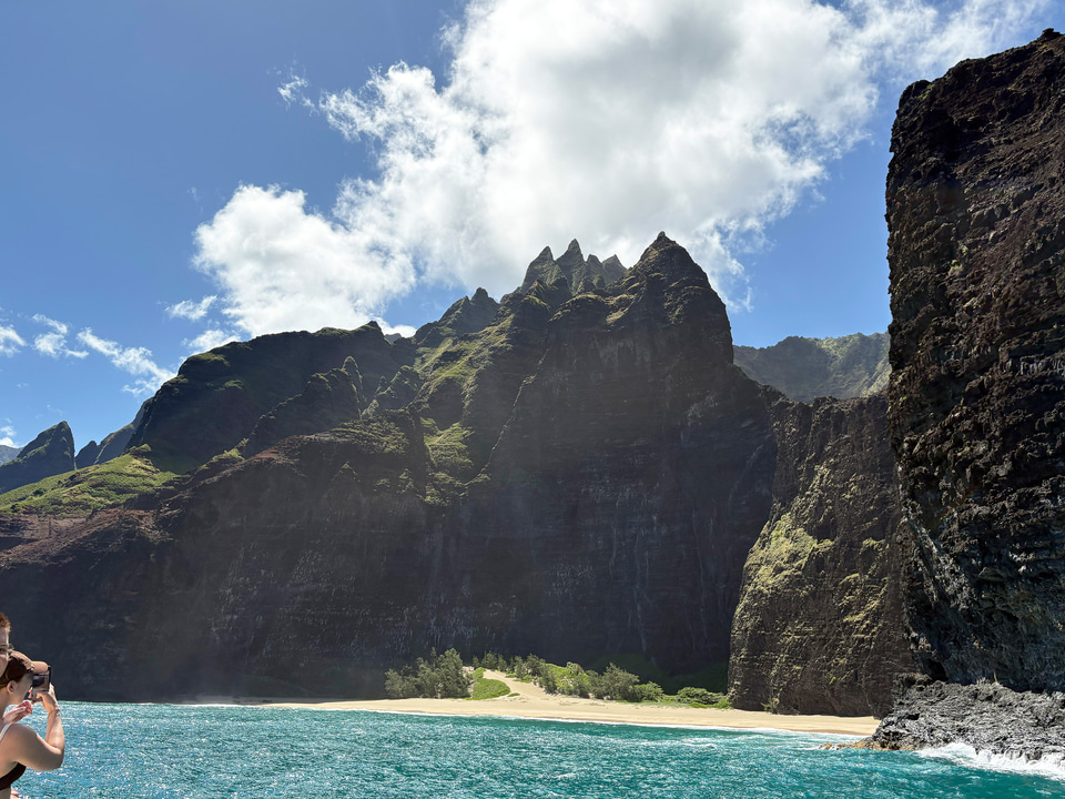 しばらくすると、荘厳なナ・パリ・コーストがゆっくりと姿を見せる。船長が、カウアイ島の歴史、見どころ、海の生物、そして目に映る壮大な自然についてガイドをしてくれる。この地が映画「ジュラシックパーク」のほか、「キング・コング」など数々のハリウッド映画のロケ地となっていること、大きな谷間はかつて数百人ものネイティブ・ハワイアンの居住地だったこと、ハワイの神話であるメネフネが住んでいたとされる場所などを聞くことができた。