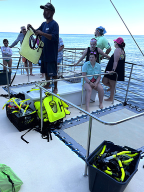 まもなくしてシュノーケルスポットに到着。その日のベストスポットに船を停めてくれる。シュノーケルの基本をおさらいし、安全に楽しむための注意点を聞いたあとは、シュノーケル用のマスクとフィン、浮き具を借りて、約1時間たっぷり海に入って遊ぶ。