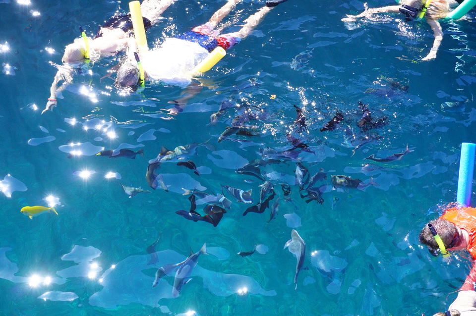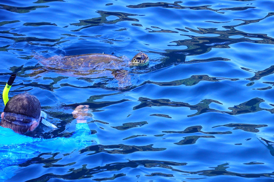 透明度の高い海中には、ハワイ州の魚フムフムヌクヌクアプアアやカラフルな熱帯魚、ホヌ(アオウミガメ)たちが泳いでいた。なお、海洋生物は連邦法および州法で保護されていて、ウミガメは3m、イルカは45m以上離れることが推奨されているので、ルールを守りながら楽しもう。
