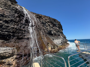 遊び尽くしたあとは、デッキに戻って再び航海の続きへ。滝が流れ、洞窟が現われ、変化に富んだ自然の勇姿に感動が押し寄せる時間となる。