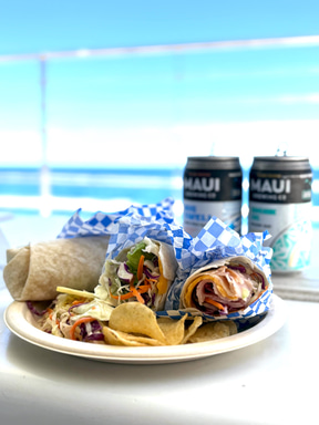 やがて海岸線が終わりに近づき、折り返し地点に。大興奮の数々を経験したあとは、ランチとともにリラックスタイムの演出が始まる。まずは予約の際に選んでおいたランチをピックアップ。ハワイのバケーションに欠かせないマイタイ、キンキンに冷えたローカルビール、ローカルブランドのジュースなども振る舞われるので、ハワイの味を堪能しよう。
