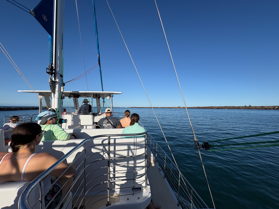港までは歩いて数分間の距離。そこで待っているのは全長約19mの大型セーリングカタマラン。船内では滑らないように裸足が推奨されている(ビーチサンダルは危ないのでNG)。桟橋に用意されている靴用ボックスに靴やビーチサンダルを預けて船に乗り込む。ライフジャケットなどの説明を聞いたら、いよいよ出発!