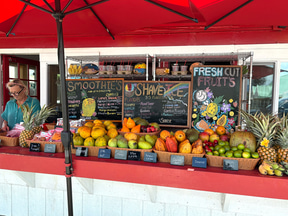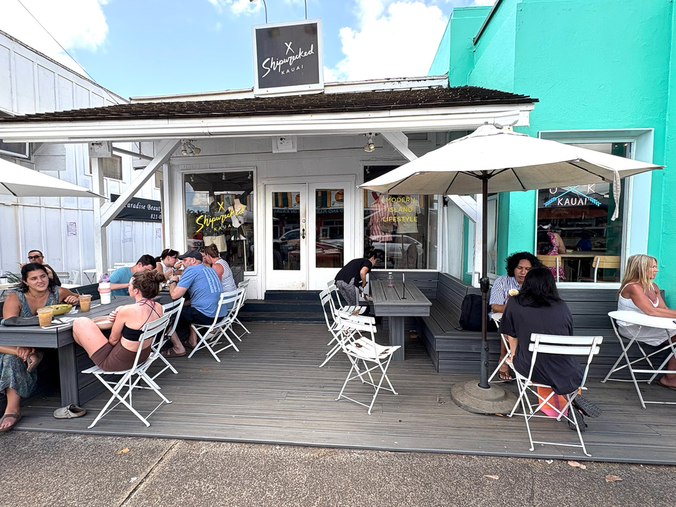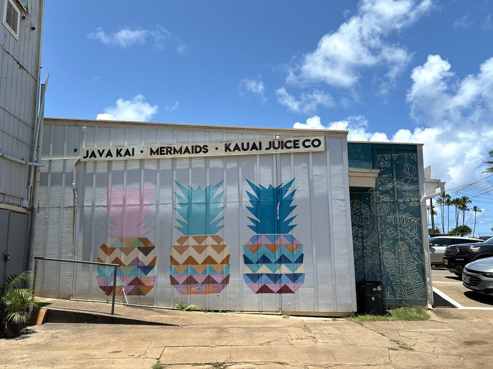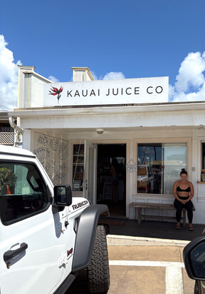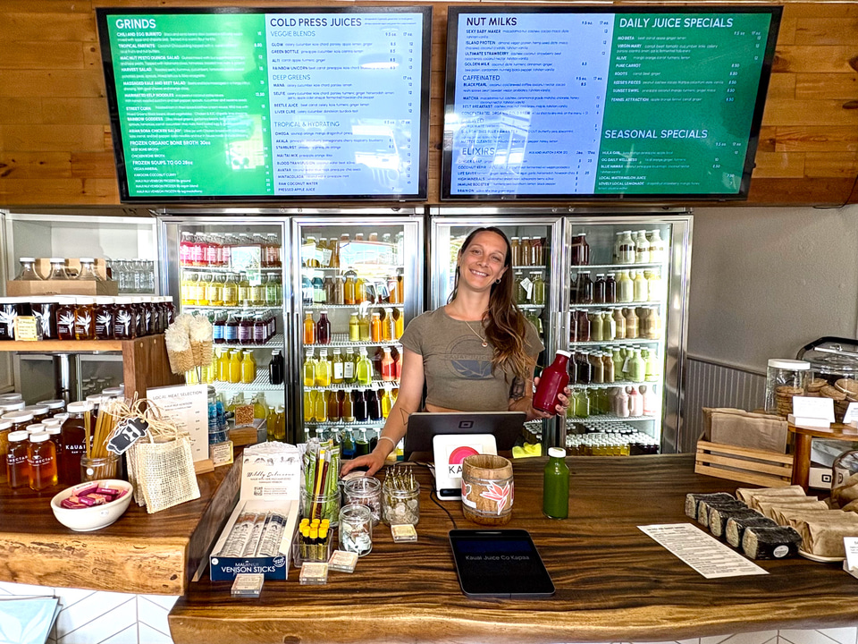 メインの交差点であるカパアの交差点のすぐ近くにあるのが「カウアイ・ジュース」。コールドプレスジュースの人気店で、高圧力により野菜やフルーツからの栄養素を丸ごと絞り出してジュースにする。果物などの食材や、塩、ハチミツ、ハーブにいたるまでできる限りハワイ産を使用し、ココナツミルクやナッツ系ミルクも自家製というこだわりぶり。