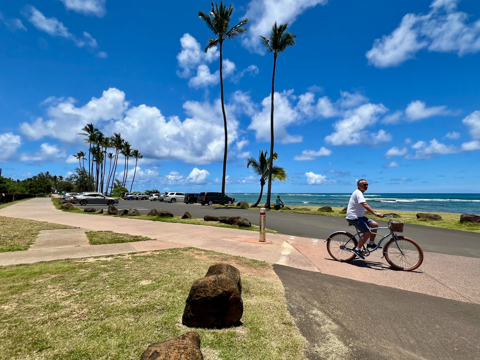 街から1本入ったところに現われるのはカパア・ビーチ。波が穏やかで住民がピクニックをしたり、サンセットも見たりする憩いの場。海沿いのサイクリングロードをもある。