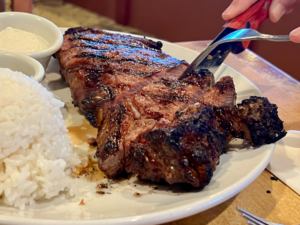 マストオーダーは、ブル・シェッド・カットと呼ばれる厚みあるプライムリブ(43ドル~)。ニューヨークステーキ(38ドル)、フィレミニョン(43ドル)などがすべて50ドル以下という価格は、オアフ島の3分の1以下。ボリュームがあるのでシェアするのがお勧め。味わいは、リピーターの多さからもお墨付きと断言できる。