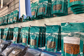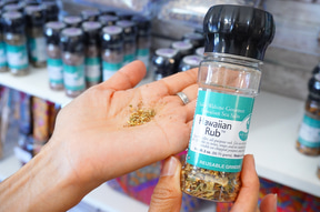 パッションフルーツ・チリペッパーやブラックラヴァなど、スパイシータイプから、多種類のハーブ入り、フルーティーなフレーバーまでが壁にびっしりと並ぶ。ボトルグラインダー入り、袋入り、本店ならではの家庭用のストックバッグに入った大量サイズもあり、まとめ買いでお得になる。日本語のパンフレットがあり、肉、魚、シチューなど用途も記載されているので参考にしよう。
