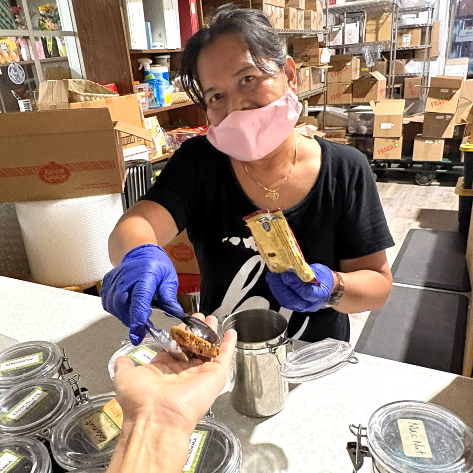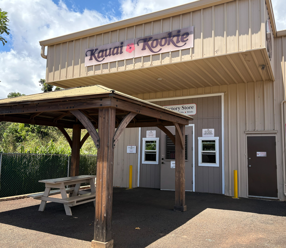 「ソルティー・ワヒネ」の並びにあるのがカウアイクッキーの工場直売店。オアフ島のスーパーマーケットやドラッグストアでも販売しているが、ここは毎日5万枚以上を焼き上げる工場とレストランの併設店舗。焼きたてのサンプルを味わって、買い物を楽しめる。