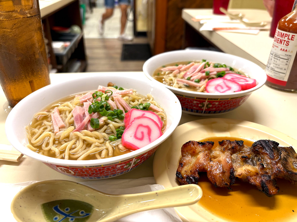 サイミンはハワイで生まれたローカルフード。発祥は諸説あり、プランテーション農園で働く日本や中国など移民の食文化が融合して生まれた麺類とされている。日系人が営む店が多く、この店を創業したのも葉村さんという日系人。1952年に創業して以来、カウアイで「サイミンといえばここ」というほど有名店となった。