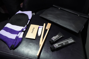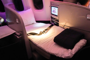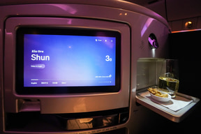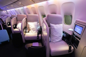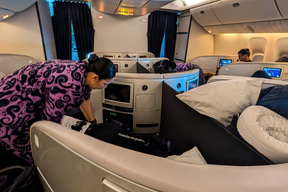 ビジネス・プレミアは、全席が斜め(ヘリンボーン配列)のシートアレンジで、照明も紫系の色とちょっと変わった雰囲気の機内で非日常を楽しめる。客室乗務員に頼めば、シートをフルフラットと着座モードに変更するセッティングをしてくれる。