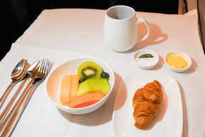 今回の往路では「ビジネス・プレミア」クラスに搭乗した。機材はボーイング 777-300ER型機。機材の都合で台北からの搭乗になったので料理はやや台湾風だが、シートやサービスはほぼ同様なので参考になるはず。