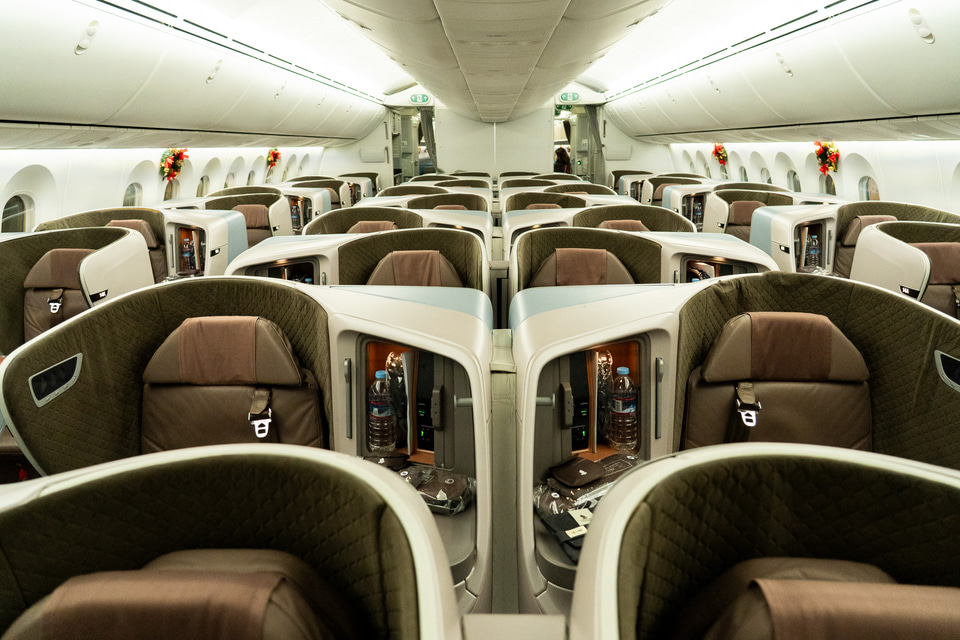 機材はボーイング 787-10型機で、ビジネスクラス36席、エコノミークラス301席の2クラス、計337席です。