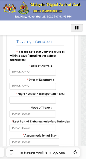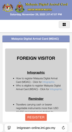 現在マレーシアに入国するには、入国カードの電子登録が必須となっています。現地に着いてからでもOKですが、私は事前に日本でやっていきました。マレーシア到着日を含む3日前から登録可能です(到着日が1月20日なら、1月18日から)。