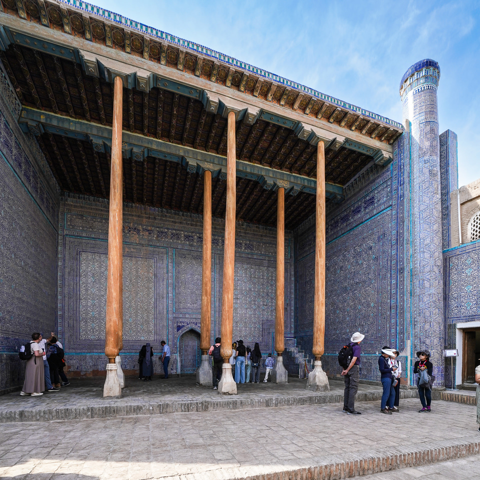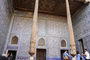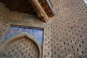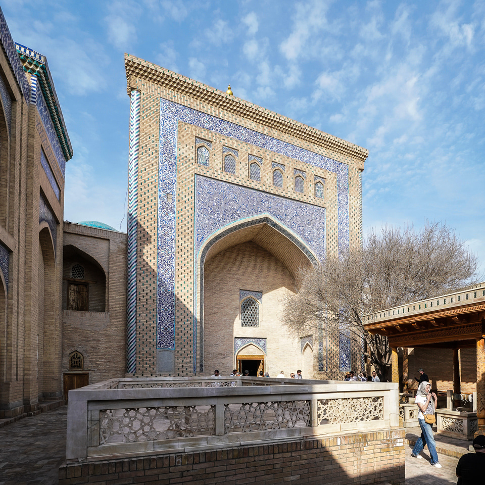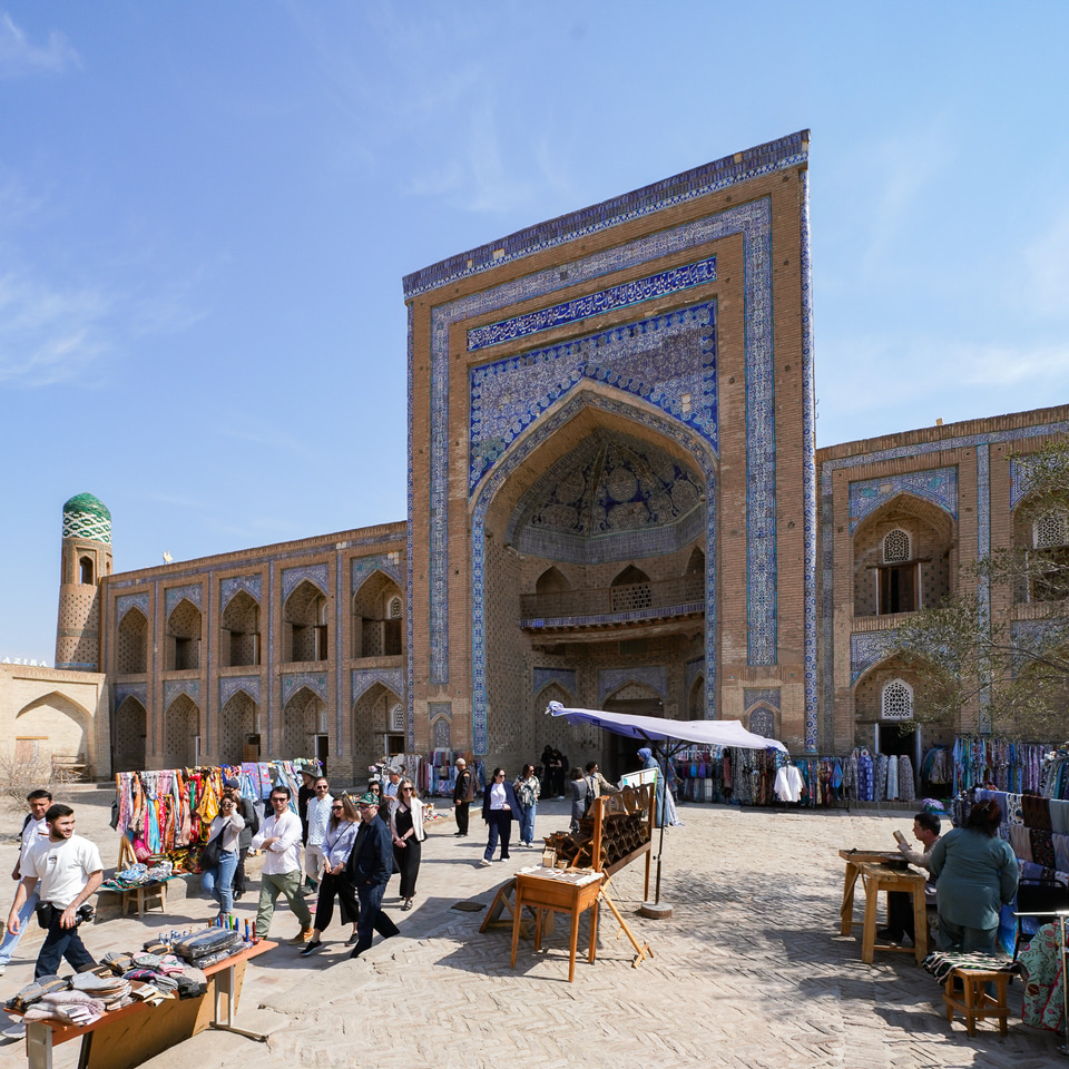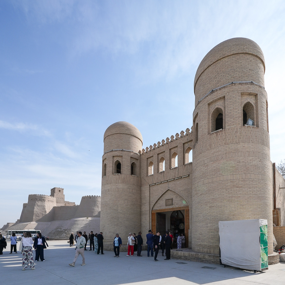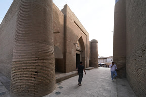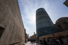 イチャン・カラとは、ウズベク語で内城という意味になる。約450×650mを8mほどの城壁に囲まれた内城都市で、モスクが20、マドラサ(神学校)が20、ミナレット(塔)は6基もある。大阪・関西万博のウズベキスタンパビリオンのモチーフともなった、213本の木柱が整然と並ぶ「ジュマ・モスク」はこのなかにある。