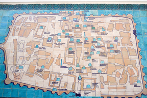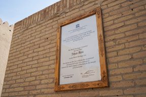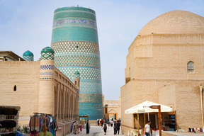 城壁の東西南北の中央に門があり、今回は西にある「オタ(アタ)・ダルワザ」門から入場した。ここで主要施設に入場できる共通入場券が販売されているので購入しておくといいだろう。歴史的建造物であるのだが、城壁内では、民族音楽の演奏やウズベクダンスなどを各所で見ることができ、ラクダと記念撮影もでき、お土産店やレストラン、カフェなどもあり、長時間でも楽しめる作りになっている。ちなみに、なかにあるトイレは有料だったので注意しておきたい。