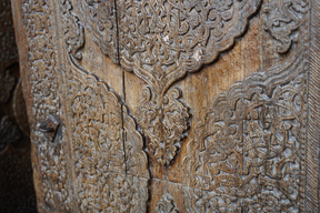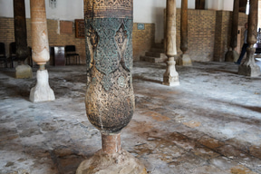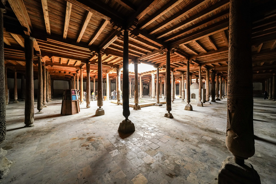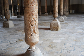 イチャン・カラ全体のちょうど中央あたりに「ジュマ・モスク」とそのミナレットがある。ジュマとは金曜日の意味。イスラム教の休日となる金曜日に礼拝に訪れるモスクのこと。今でも礼拝に使われている。10世紀に建てられたとされていて、チンギス・ハンによって征服され破壊されたあと、17世紀までに再建を繰り返して今の形になっている。薄暗いなかに213本のたくさんの柱が並ぶモスクは神秘的だ。柱の彫刻は、それぞれで異なっている。