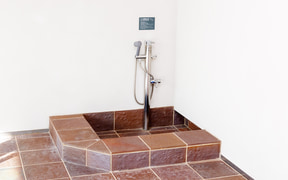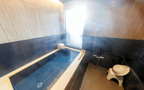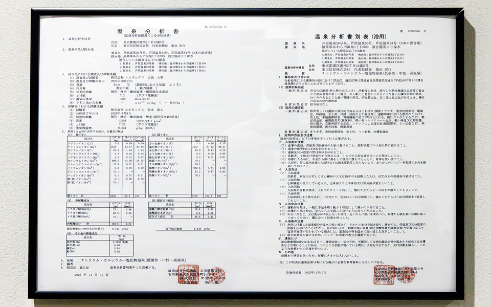 注目の浴室は小さなホテルなら大浴場と名付けてしまえるほどの広さ。芦原の街並みを一望できる窓際に大きな湯舟が配置されており、自家源泉の天然温泉を気兼ねなく自由に堪能できる。このお湯は敷地内にある3本の源泉を混合したもので、泉質は「ナトリウム・カルシウムー塩化物温泉」となっており無色無臭。