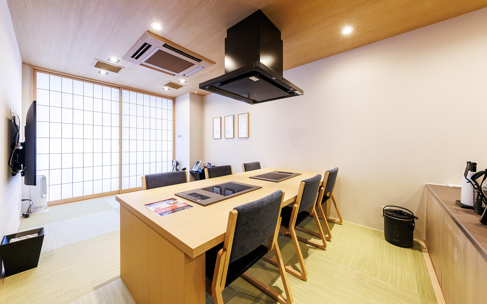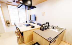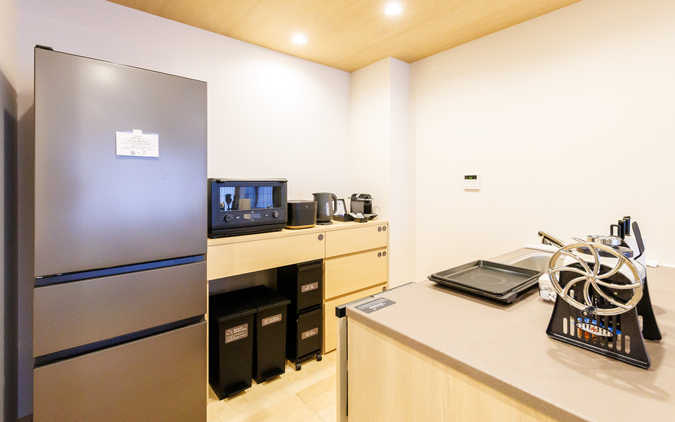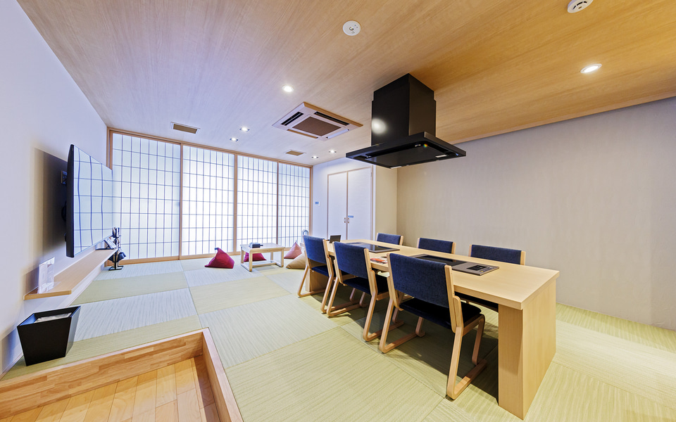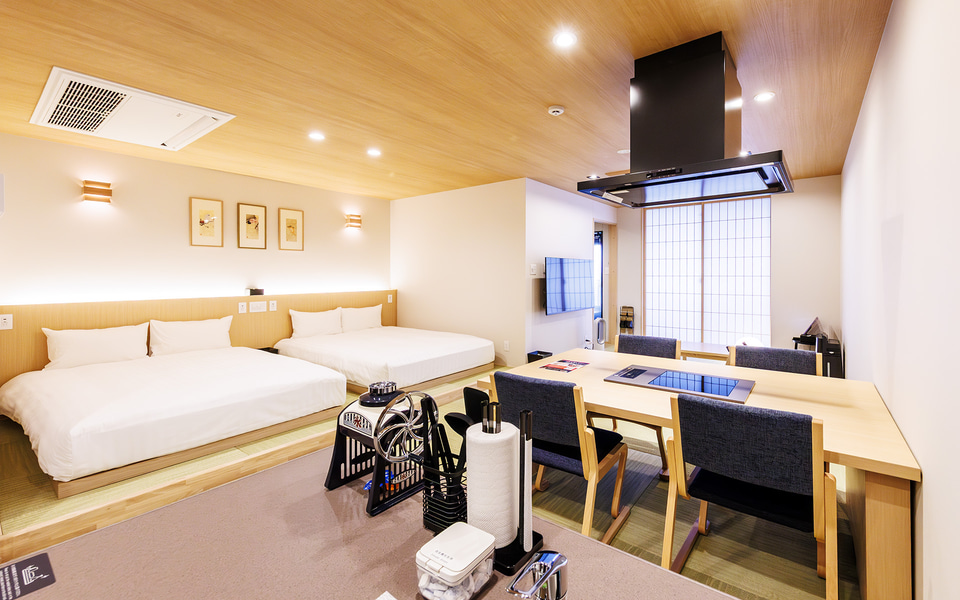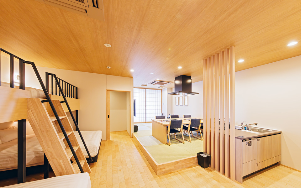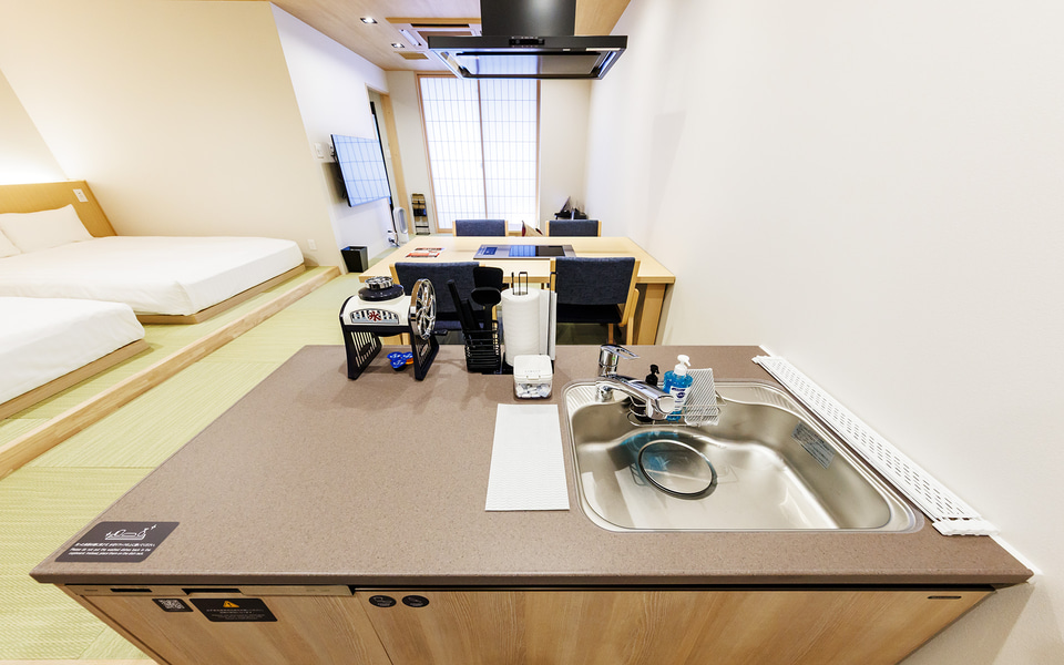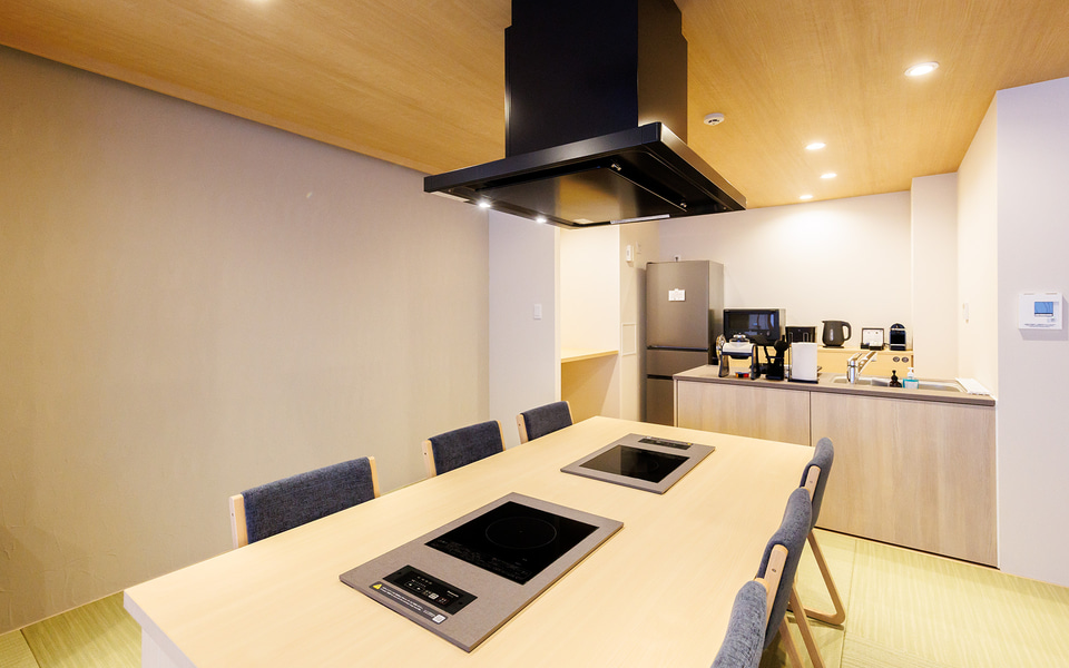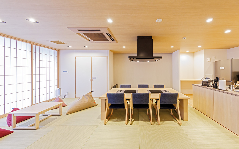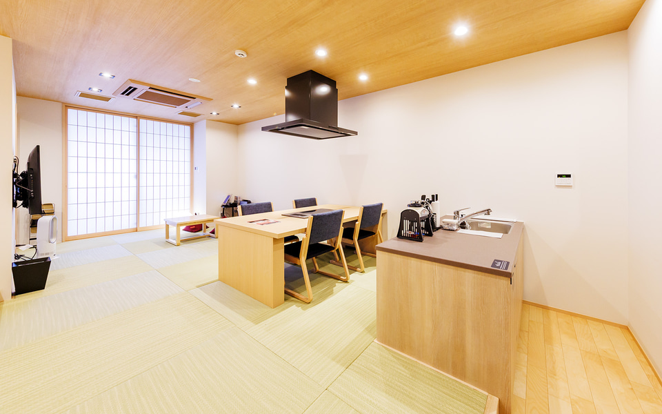 今回利用したのはもっとも広いスペースを持つAタイプの客室。6名用で76m2もの広さがあり、広いリビングスペースには6人用の大きなテーブルを備えたダイニング、そしてシンクや冷蔵庫、炊飯器などを備えたミニキッチンを用意する。