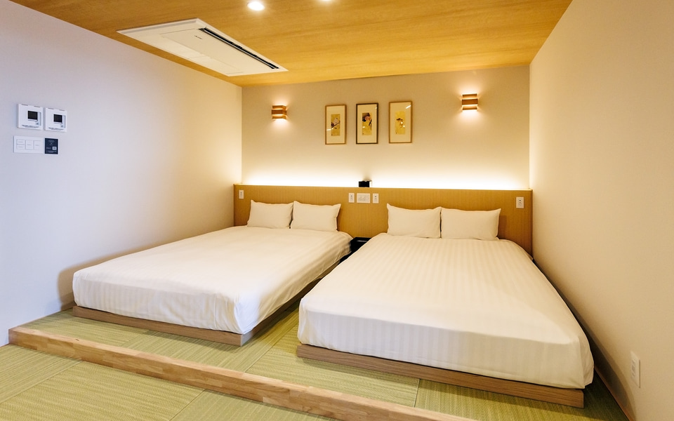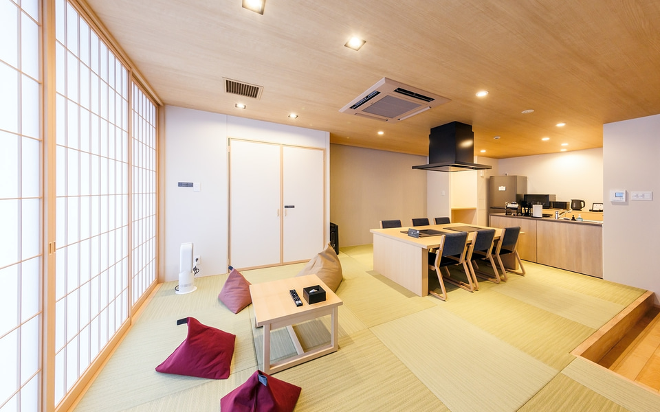 ベッドルームにはダブルサイズのベッドが2台収まるほか、リビングスペースに2組の布団を敷くことができるため、ファミリー+祖父母のような2~3世代での旅行に向きそうなレイアウトだ。さらにリビングの外には15m2のテラスまで用意しており、ゆったりと「おこもり」できる空間といえそう。