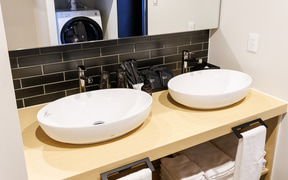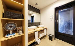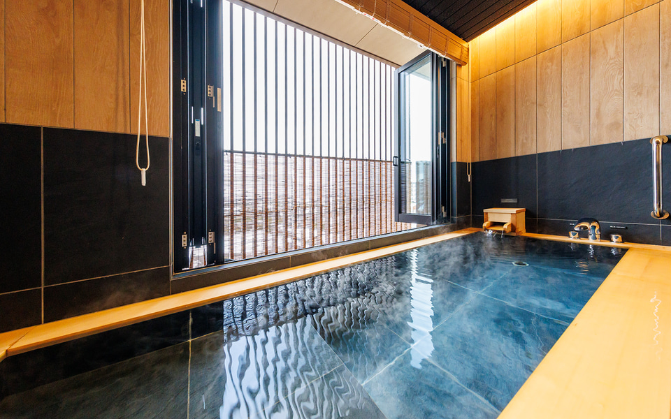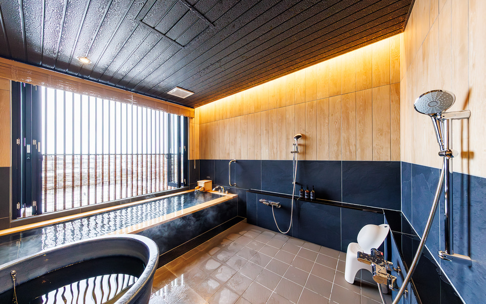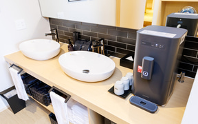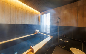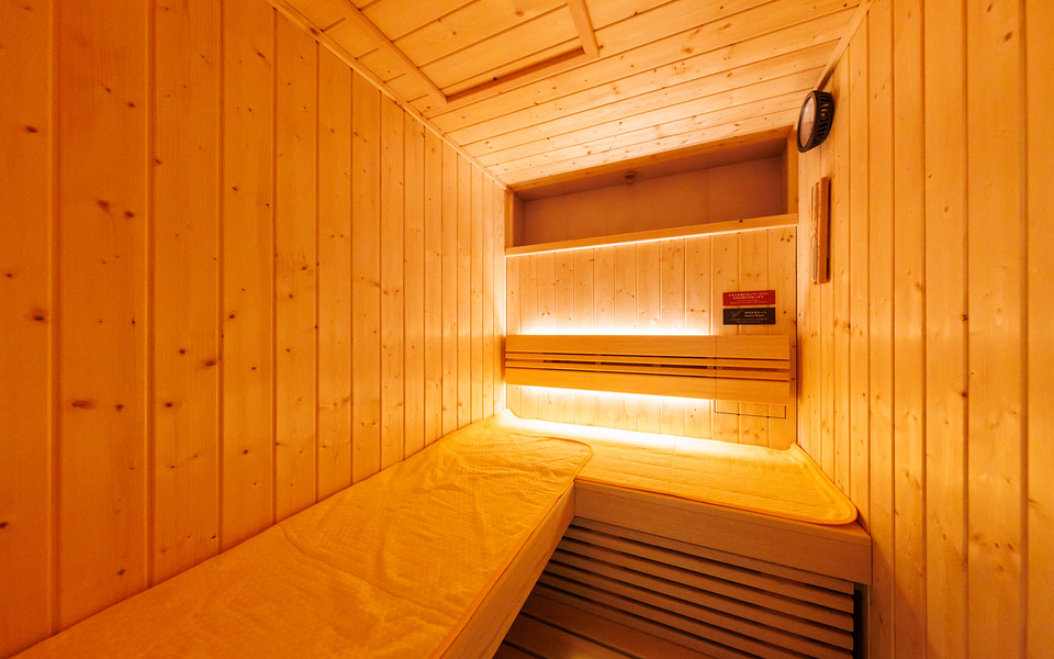 湯温を42℃に保つために加温や加水を行なっているものの、地元の人によれば以前はこの場所に公共温泉施設があり、その時代から「評価が高かった源泉」とのこと。実際に入ってみると、肌に優しく柔らかなお湯といった印象で時間を忘れてしまうほど。滞在中に何度も楽しんでしまった。また、Aタイプの客室には専用のサウナも用意しており、浴室には水風呂まである。温度の設定が自由にできるほかロウリュも可能なので、いつでも好きなときに「整う」ことが可能だ。