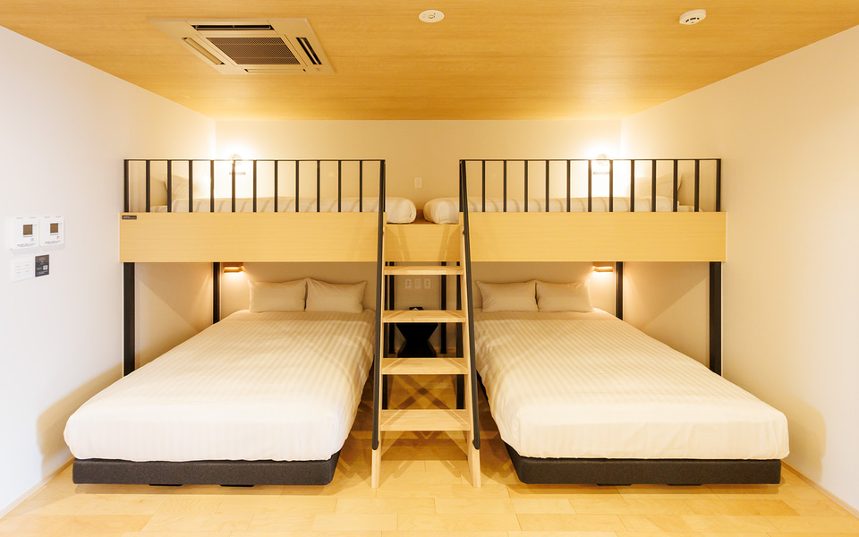 もっとも部屋数が多く用意されているのがこのタイプ。58m2の客室内にはAタイプ同様にリビングやミニキッチンを備えており定員は6名。寝室はダブルベッド2台の上にバンクベッド2台を配置する構造で、ファミリー向きのアレンジになる。