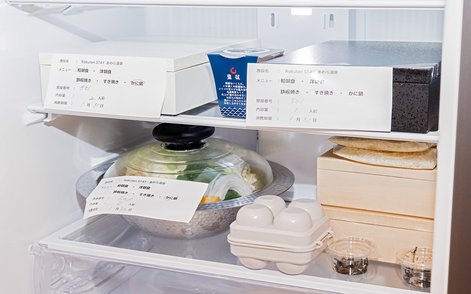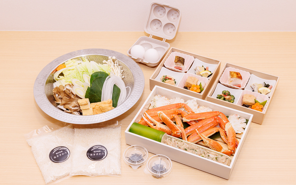 今回は夕食にずわい蟹の蟹鍋&福井のおばんざいセット、朝食に塩荘海鮮一舟とおばんざいの和朝食BOXをチョイスしてみた。食材はチェックイン前に冷蔵庫に収められているので、時間にとらわれず好きなときに食べることができる。調理方法は専用サイトにマニュアルが用意されているし、素材もカット済みとなっているのでカンタンだ。ただし、炊飯には1時間ほどかかるので事前に用意しておくのを忘れずに。