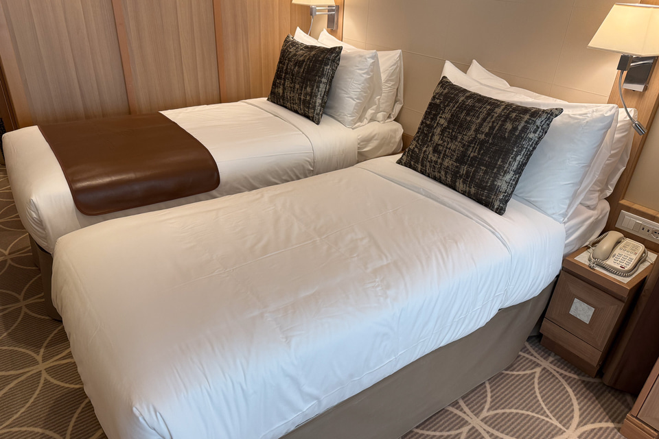 ついでに言うと、客室のベッドはツインだがやや幅の狭い仕様(ナローベッド)なので、ルームサービスに依頼して2台のベッドをくっつけてしまうのがお勧めと聞いた。これで落下の不安もなくなる。