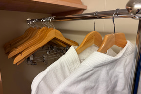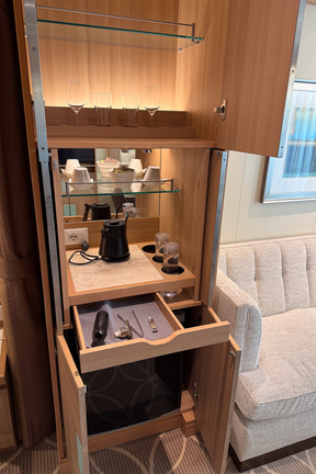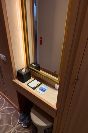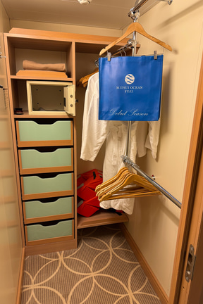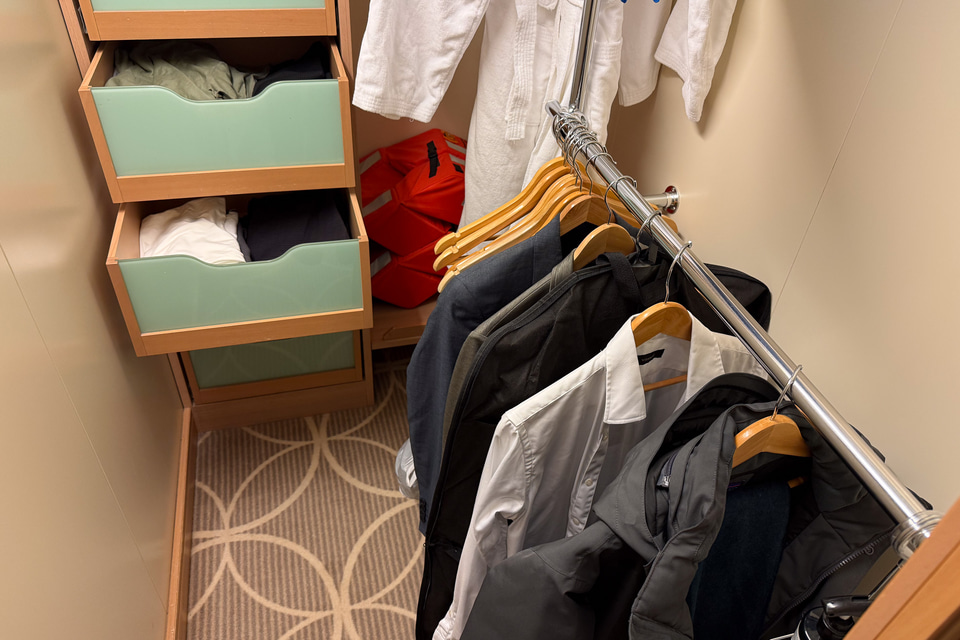 80Lクラスのスーツケースを広げても余裕があるのはスイート船室ならではだが、着替えや入浴のたびに開け閉めするのはスマートじゃないので、部屋に入ったら真っ先に荷物を展開して、まずはウォークインクローゼットに1週間分の衣類を収納してしまう。滞在中に1晩だけフォーマル指定の日があったので、持ち込んだスーツにシワが付かないよう、早めにハンガーに掛けておきたい。
