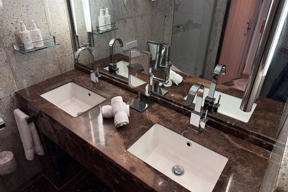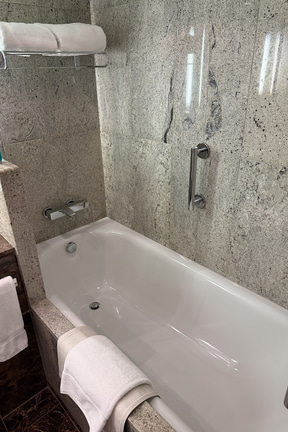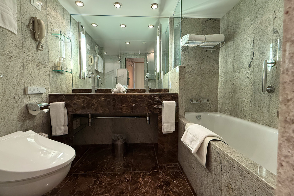 今回滞在した「ベランダスイート」は計167室ある中心的な客室カテゴリーで、平均面積は26.4~30.2m2。リビングエリアと寝室エリア、ウォークインクローゼット、浴室があり、特に浴室はシャワーブース・バスタブ・ダブルシンクの洗面台・洗浄機能付きトイレを備える贅沢な作りだった。
