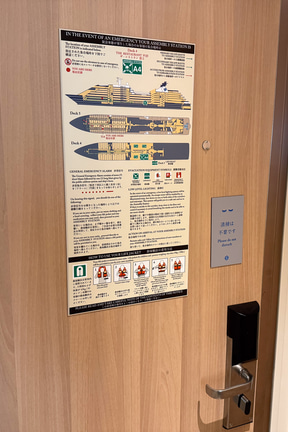 ひとしきり部屋を見て回って、電源コンセントの位置を確認したり、船内Wi-Fiを接続してみたり、安全ビデオを視聴してみたり(これは必須)。まずは部屋に何があるかを認識しておくのがお勧め。