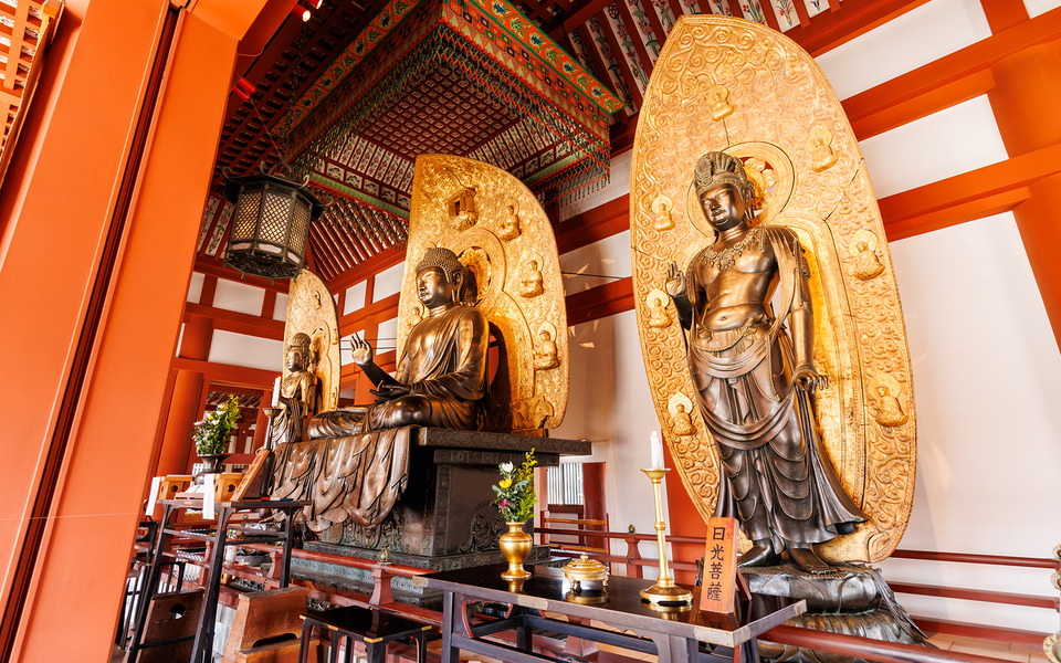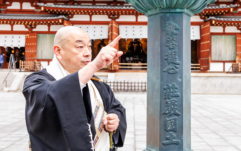 そこで待っていてくれたのが大谷徹奘(てつじょう)副住職。年間ほとんどを法話のために全国行脚に充てている名物僧侶だ。大谷副住職はこうした奈良のお寺の特徴ともいえる伽藍配置について、お釈迦様を祀る東西の塔が過去を、薬師三尊像を祀る金堂は現在を、大講堂は未来の人づくりを、と境内で過去から未来までを勉強できるようになっているためだと説明。また「南向き」「(建物内)土足」「金属の仏様」といったところが奈良のお寺の特徴とも教えてくれた。今まで京都、奈良で「古都」とひとくくりにしてしまっていたが、時代背景などでこうした違いがあるのは興味深い。