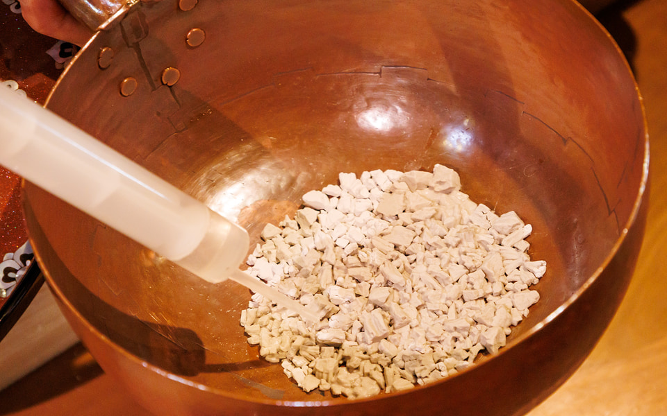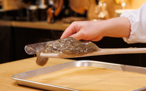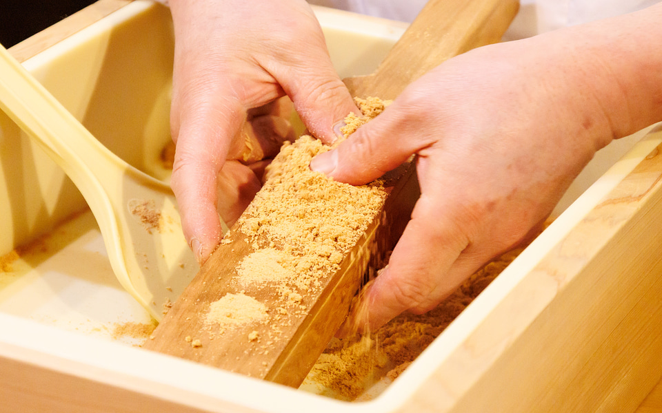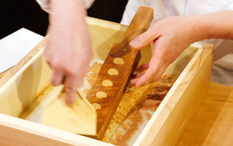 さらに、注目したいのがEX旅先予約に用意されている「つくりたて和菓子の特別コース」。このコースでは「触れば汚れる」と語り、なによりも素材のよさを重視する店主の喜多誠一郎氏がカウンターに立ち、目の前で作りあげていく菓子を味わうことができるのだ。材料に水を吸わせ、砂糖を加え、練り上げる。解説はもちろん時にはトリビアを交えつつ、最低限の仕事で美しく美味しい和菓子を作り上げていく、そんな様子を目前で見るのはまさにライブ。