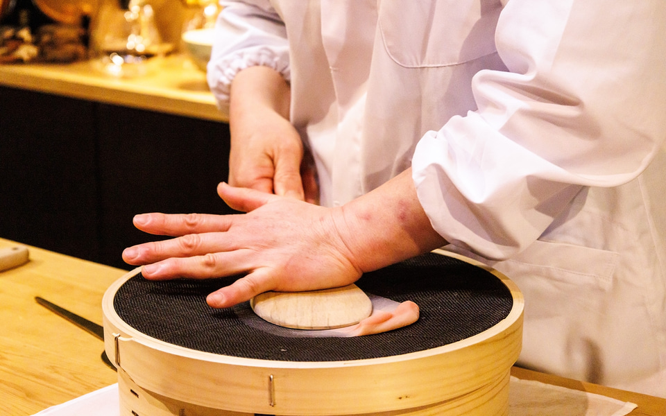 目の前で完成した和菓子は瑞々しく、ほどよい甘さと素材の風味が口の中に広がっていく。このコースでは通常のコースでは味わえない特別なメニューを堪能できる。至福の時間を過ごせること間違いなしだ。