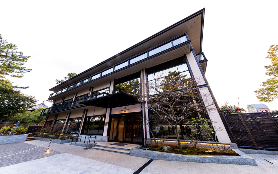 近鉄奈良駅から西へ向かって3分ほど。興福寺の目の前に位置するのが登大路ホテル。スイートやデラックスなどわずか13室のみの限られた空間になる。歴史をたどれば興福寺の敷地内という立地もあって窓からは中金堂を望むことができ、特に夕闇に沈んでいく甍や鴟尾の美しさは必見。1階には宿泊者以外でも利用が可能なレストラン「LE BOIS(ル・ボワ)」。店内にはスタインウェイ&サンズのグランドピアノが置かれており、毎月第3土曜にはサロンコンサート付きランチ、ディナーを楽しむことができる。